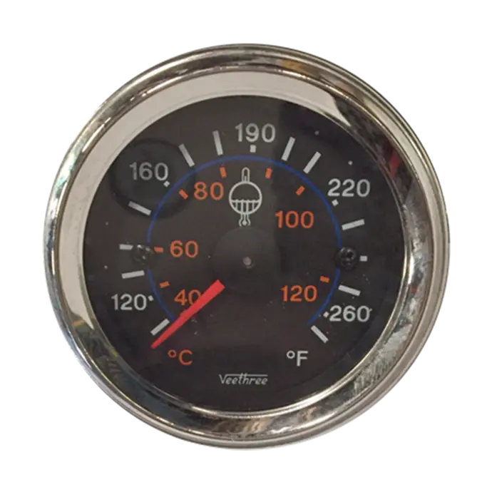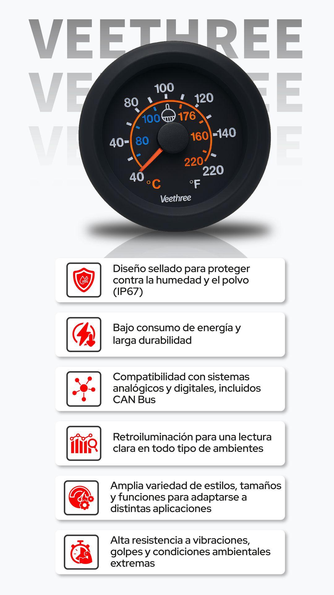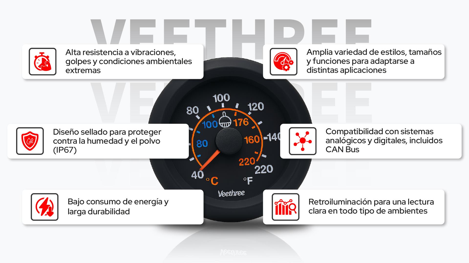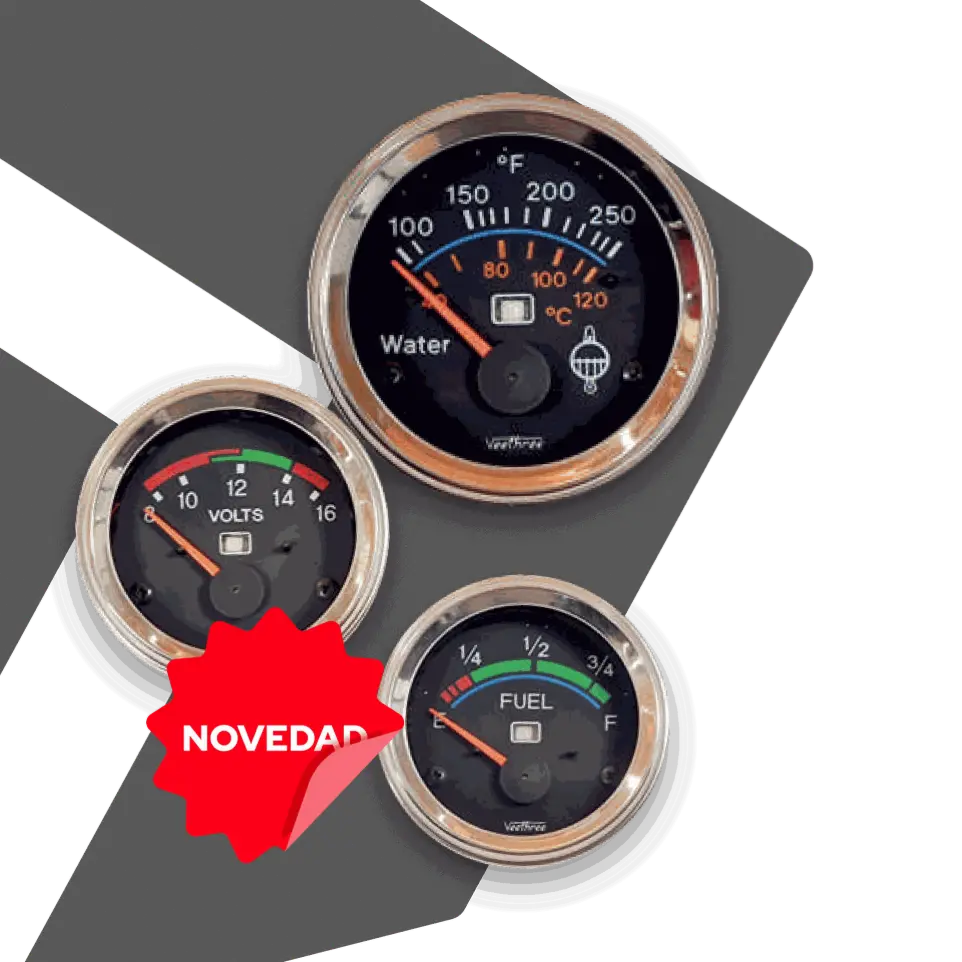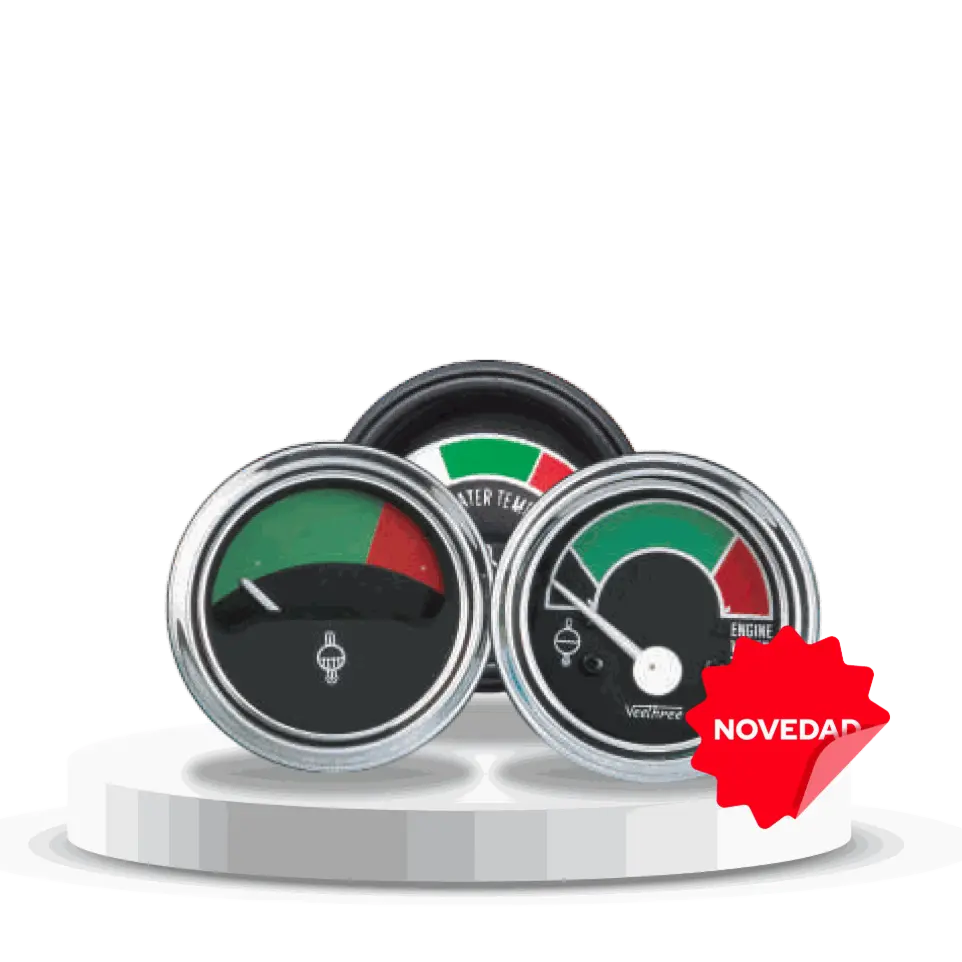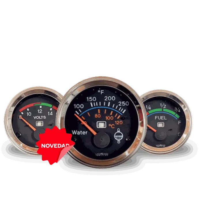 Con tecnología de bobina cruzada y núcleo de aire los medidos Veethree se encuentran disponibles en distintos rangos de temperatura (hasta 300°F / 150°C), diámetros de 52 mm y 60 mm, y versiones de 12V o 24V. Y son compatibles con sensores VDO, DATCON, DEUTZ, JD, MF, entre otros.